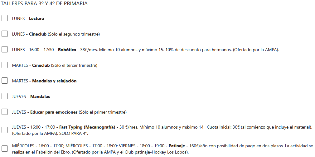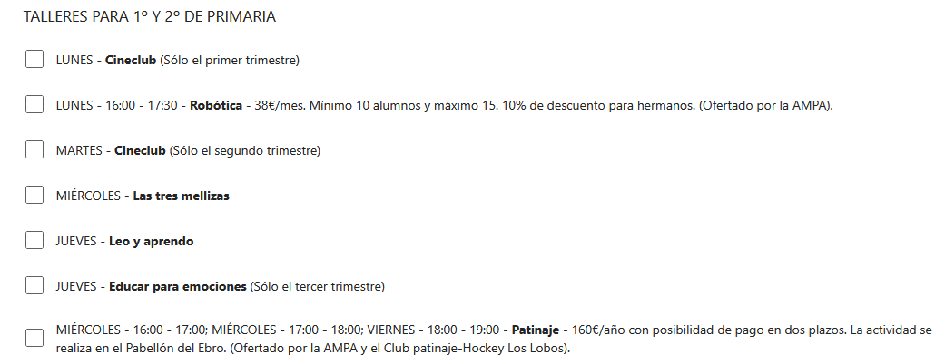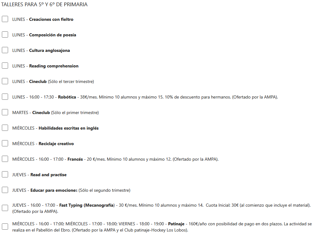 Los talleres ofertados este curso escolar son los siguientes: